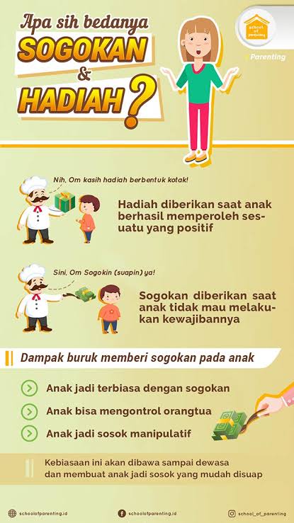 Memberikan anak iming-iming atau menyogok anak dengan barang atau diwujudkannya harapan saat anak menolak belajar atau mengerjakan kewajibannya bisa saja menjadi jalan pintas. Sayangnya, kebiasaan kasih sogokan bisa menimbulkan hasil yang kurang baik.